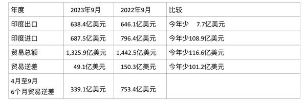 印度国家今年4月至9月期间,对外贸易逆差为399.1亿美元,而2022年4月至9月同期,贸易逆差为753.4亿美元。