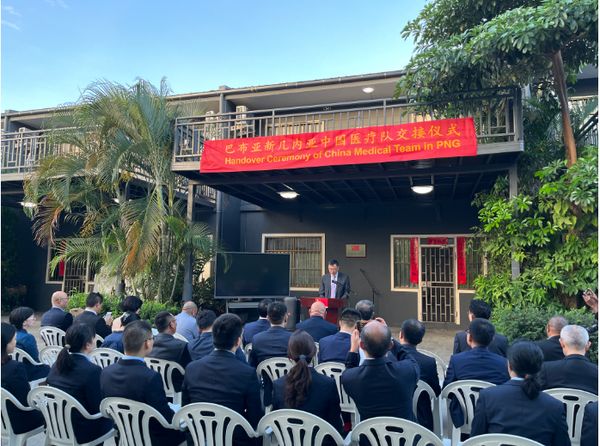 北京时间10月9日下午,第12批与第13批援巴布亚新几内亚中国医疗队交接仪式在巴新中国医疗队驻地举行。澎湃新闻记者 刘栋 图