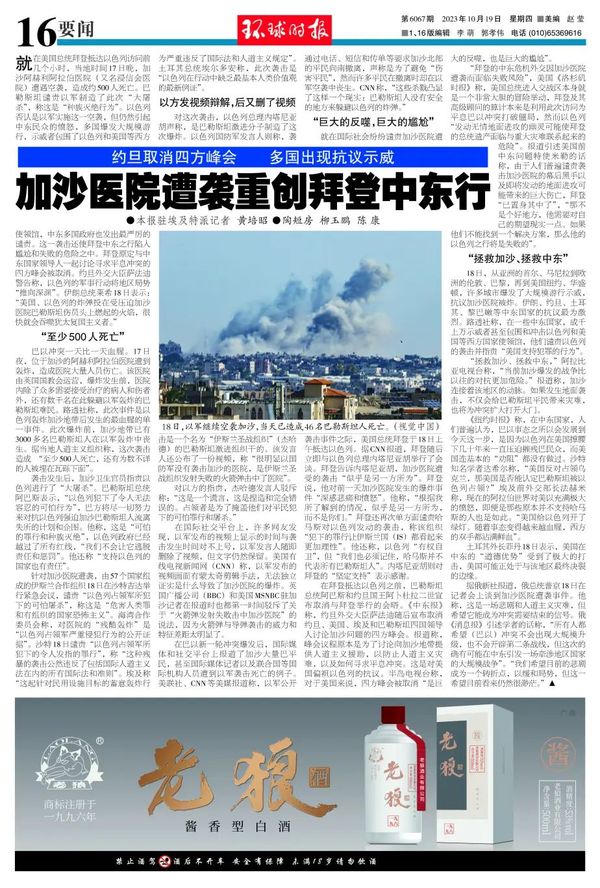 约旦取消四方峰会,多国出现抗议示威。加沙医院遭袭重创拜登中东行。