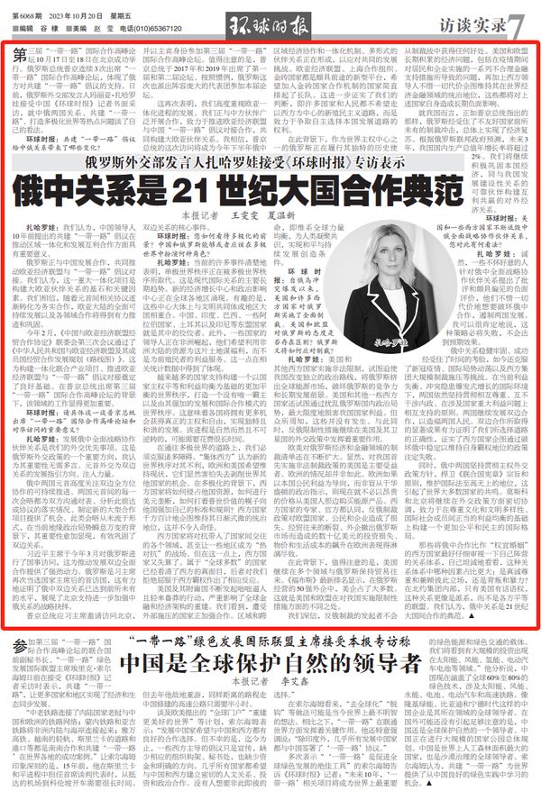 第三届“一带一路”国际合作高峰论坛10月17日至18日在北京成功举行。俄罗斯总统普京连续3次出席“一带一路”国际合作高峰论坛,体现了俄方对共建“一带一路”倡议的支持。日前,俄罗斯外交部发言人玛丽亚·扎哈罗娃接受中国《环球时报》记者书面采访,就中俄两国关系、共建“一带一路”、打造多极化世界等热点问题谈了自己的看法。