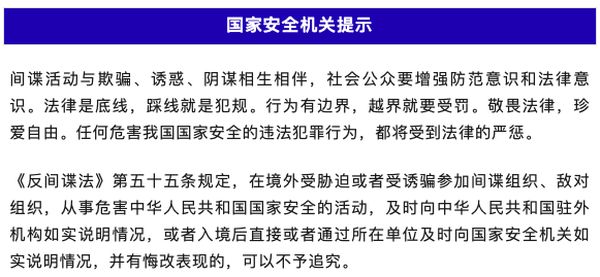 据国家安全部微信公众号22日消息,近日,国家安全机关公开一起美国间谍案。2021年7月23日,四川省国家安全机关破获一起美国间谍情报机关对我国赴美访学人员实施策反、发展的重大间谍案件,挖出了美方在我国重点国防军工单位安插的情报眼线侯某某,消除了重大隐患。
