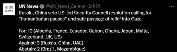 据联合国网站消息,当地时间10月25日,联合国安理会就巴以局势举行紧急会议。期间,美国提交的一份有关巴以问题的决议草案被中国、俄罗斯和阿联酋联合反对,未获通过。