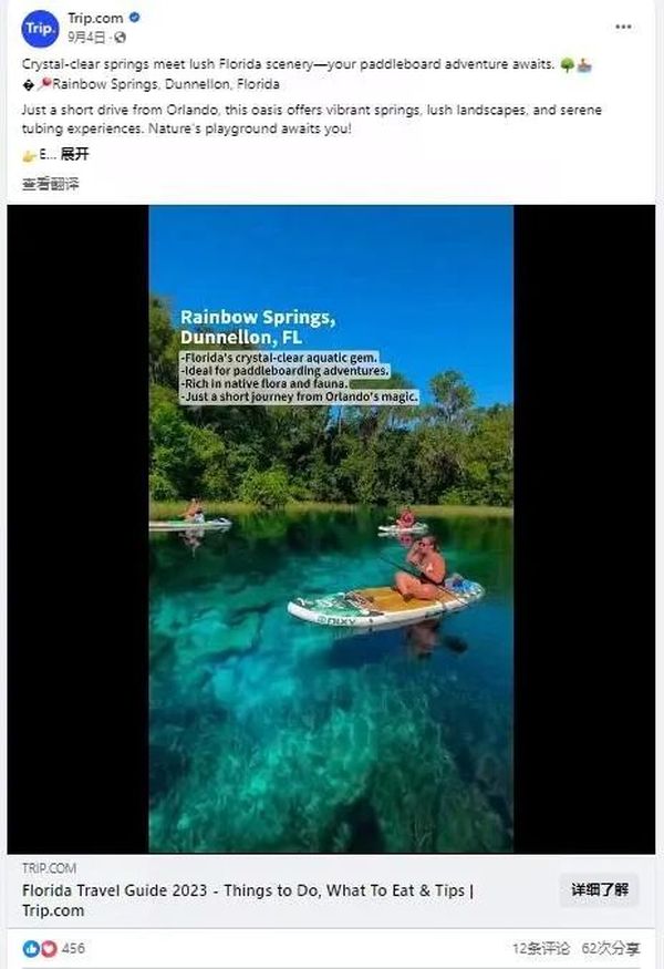 如携程,其在脸书(Facebook)平台账号(Trip.com)从推进国际化战略出发,结合目前旅游市场对探险游和生态游的偏好,在监测周期内推出多篇次涉及上述旅游主题景点介绍的网帖,吸引众多海外网友关注。如该账号9月4日发布网帖,内容为:“清澈见底的泉水遇见茂密的佛罗里达风景——你的划板冒险在等待着。”除文字外,该网帖还配以游客在碧波荡漾中划艇的视频,令人神往的生态美景获得网友456次点赞、12条评论、62次分享。部分网友在评论中表达了对携程相关产品的认可,在潜移默化中接纳了携程的企业形象。