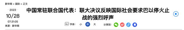中国常驻联合国代表:联大决议反映国际社会要求巴以停火止战的强烈呼声
