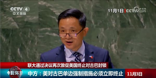 11月1日至2日,联大审议“必须终止美国对古巴的经济、商业和金融封锁”议题。绝大多数国家代表发言支持古巴,要求美国结束对古巴的封锁。中方表示,美国封锁60多年累计对古巴造成近1600亿美元损失,国际社会不能对此视而不见,应予同声谴责。美国对古巴等国持续施加的单边强制措施必须立即终止。