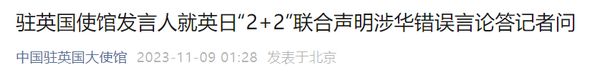 驻英国使馆发言人就英日“2+2”联合声明涉华错误言论答记者问记者:11月7日,英日举行外长防长“2+2”会谈并发表联合声明,……