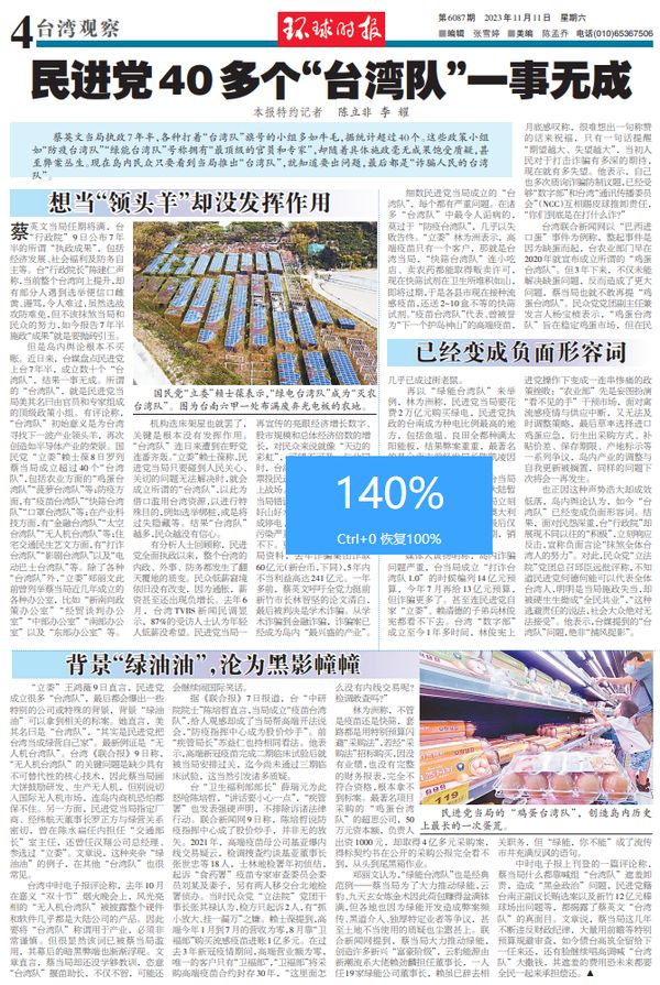 台湾中时电子报评论称,去年10月在嘉义“双十节”烟火晚会上,风光亮相的“无人机台湾队”被披露整个硬件和软件几乎都是大陆公司的产品。因此要将“台湾队”称谓用于产业,必须非常谨慎。但很显然该词已被蔡当局滥用,其幕后的暗黑弊端也渐渐浮现。文章直言,蔡当局却还没学够教训,恣意“台湾队”揠苗助长,不仅不智,可能还会继续闹国际笑话。