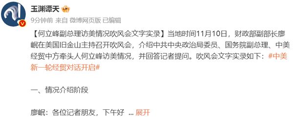 当地时间11月10日,财政部副部长廖岷在美国旧金山主持召开吹风会。图源:@玉渊谭天