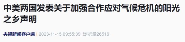 11月15日,中美两国发表关于加强合作应对气候危机的阳光之乡声明,声明全文如下: