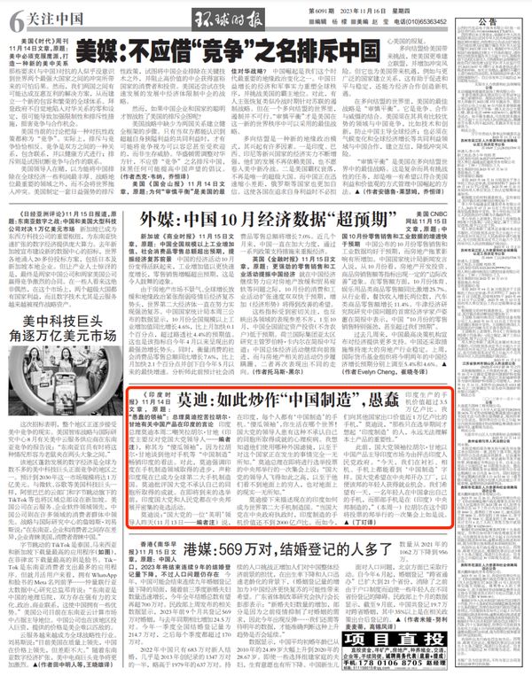 此前,国大党领袖拉胡尔·甘地以中国产品主导印度市场为由抨击印度人民党政府。“今天,我们在衬衫、相机、手机上都能看到‘中国制造’字样。国大党希望在中央邦开办工厂,以便该邦的年轻人获得就业机会。我们希望有一天,一名年轻人在中国拿出自己的手机,而那部手机是在(印度)中央邦制造的,”(本周一)拉胡尔在这个即将投票的邦举行的一次集会上如是说。(丁玎译)
