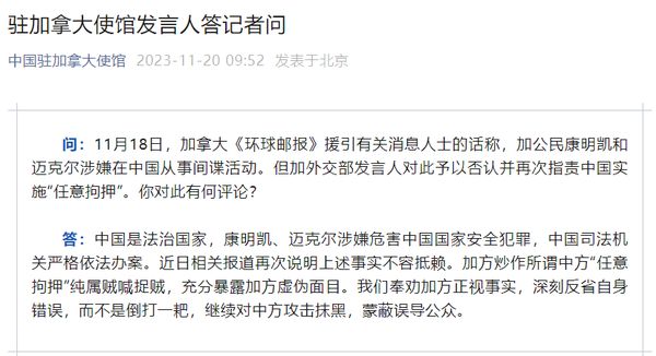 中国驻加拿大使馆:加方炒作所谓中方“任意拘押”纯属贼喊捉