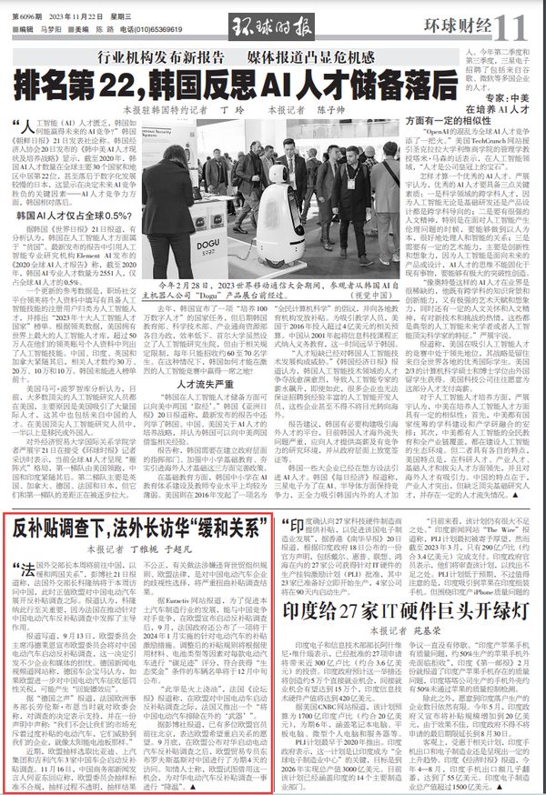 “此举是火上浇油”,法国《论坛报》报道称,在欧盟对中国电动车启动反补贴调查之际,法国又推出一个“将中国电动汽车排除在外的‘武器’”。