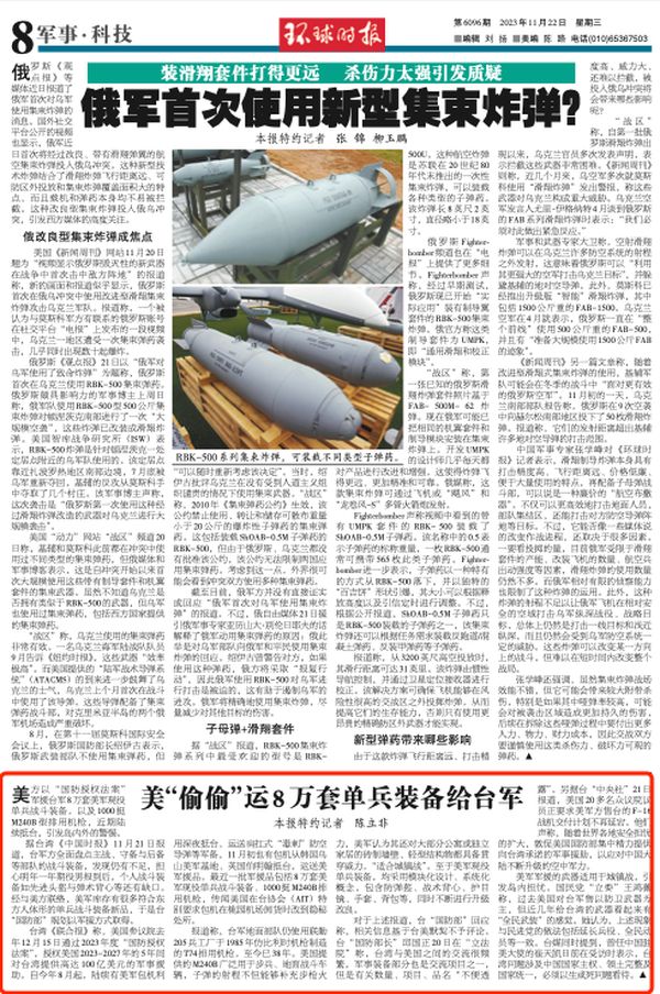 台湾《联合报》称,美国参议院去年12月15日通过2023年度“国防授权法案”,授权美国2023-2027年的5年间对台湾提供高达100亿美元的军事援助。自今年8月起,陆续有美军包机利用深夜抵台,运送肩扛式“毒刺”防空导弹等军备,11月初也有包机从韩国乌山美军基地、英国伯明翰抵台,运送美军援品。最近一批军援品包括8万套美军现役单兵战斗装备、1000挺M240B排用机枪,传闻美国在台协会(AIT)特别要求包机在桃园机场卸货时改到隐秘处所。