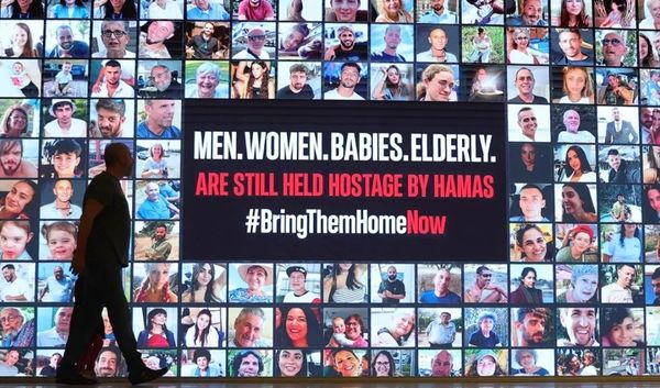 当地时间2023年11月22日,以色列特拉维夫,墙上贴满遭哈马斯扣押的人质照片。