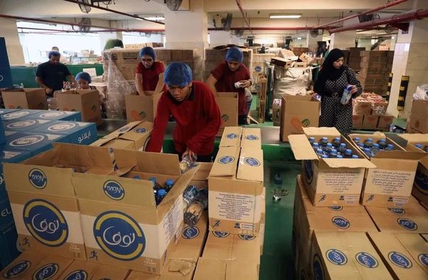 当地时间2023年11月22日,埃及开罗,巴以冲突持续,仓库里的志愿者正用箱子打包食品,“埃及食品银行”向加沙地带巴勒斯坦民众提供物资援助。