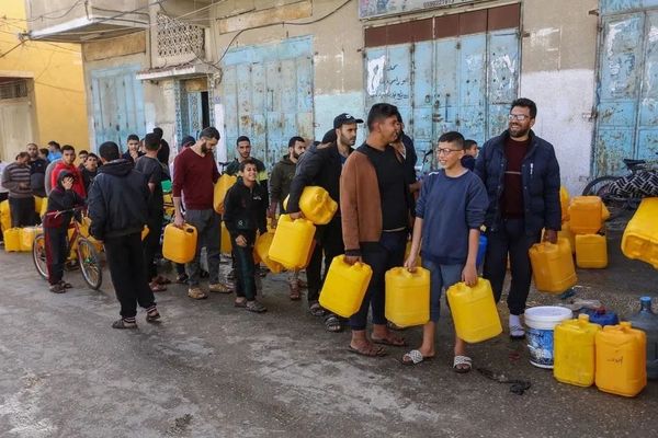 当地时间2023年11月23日,加沙地带饮用水短缺,民众排队取水。
