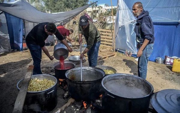 当地时间2023年11月23日,加沙汗尤尼斯,土耳其人道主义救助协会为人们提供食物援助。