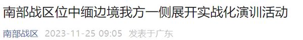 中国人民解放军南部战区新闻发言人田军里空军大校表示,根据年度训练计划,中国人民解放军南部战区组织陆军部队于11月25日起,位中缅边境我方一侧举行实战化演训活动,旨在检验战区部队快速机动、边境封控、火力打击能力。战区部队时刻做好应对各类突发情况准备,坚决维护国家主权、边境稳定和人民生命财产安全。
