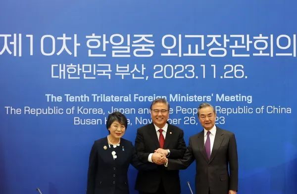 当地时间2023年11月26日,中共中央政治局委员、外交部长王毅在韩国釜山同韩国外长朴振、日本外相上川阳子共同出席第十次中日韩外长会。