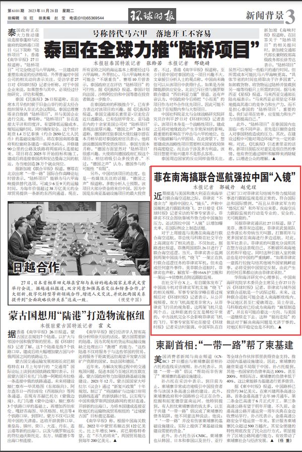 近期接连与美国和澳大利亚在南海举行联合海空巡航之际,菲律宾“不遗余力”地将中国拉入“镜头”,声称中国舰机进行跟踪和绕飞。27日接受《环球时报》记者采访的军事专家表示,菲律宾不仅企图依靠域外势力给中国施加压力,还试图拉中国“入镜”以增加曝光率,在国际舆论上制造话题。