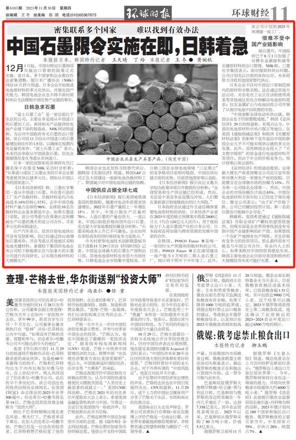 “富士石墨工业”是一家总部位于东京的公司,主要业务是将从中国进口的石墨加工后,再将相关产品提供给电池产业链下游的制造商。NHK网站报道称,为应对中国政府有关石墨的出口管制,该公司将11月份从中国进口的石墨量增加到往年的1.5倍,以确保在短期内有足量的库存。“富士石墨工业”表示,未来仍会争取从中国获取石墨,但也会根据情况变化考虑从非洲进口。