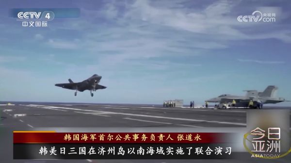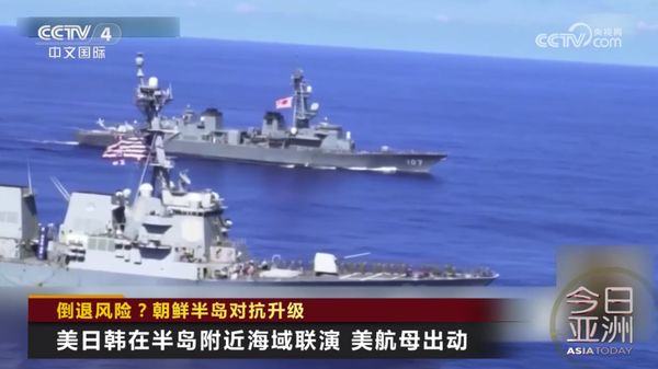 26日,美日韩三国军舰曾在济州岛东南海域举行联合演练。韩国国防部称,美国“卡尔·文森”号航空母舰、“斯特雷特”号驱逐舰和“基德”号驱逐舰与韩国“世宗大王”号驱逐舰和日本“雾雨”号护卫舰参加了防空演练和海上机动演习。