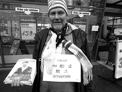 △斯德哥尔摩街头以卖杂志为生的低收入者,胸口挂着一块写有“接受刷卡付款”的牌子
