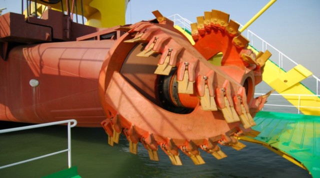 这艘挖泥船的作业能力惊人,能够从海底挖泥,然后以每小时4500立方米的速度排泥。