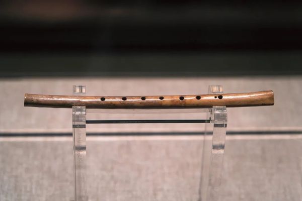 贾湖骨笛,河南舞阳贾湖遗址出土。贾湖遗址的使用年代距今7800到9000年。而这支笛是用鹤的骨头制成,类似的骨笛在贾湖遗址共出土了20多个,分为5到9孔