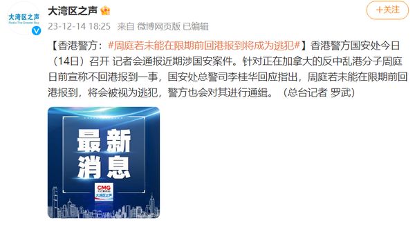 据@大湾区之声 微博消息:针对正在加拿大的反中乱港分子周庭日前宣称不回港报到一事,国安处总警司李桂华回应称,周庭若未能在限期前回港报到,将会被视为逃犯,警方也会对其进行通缉。