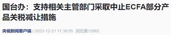 国台办:支持相关主管部门采取中止ECFA部分产品关税减让措施国务院台办发言人朱凤莲12月21日表示,……