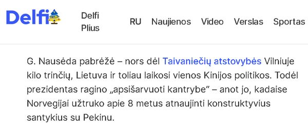 同一天,立陶宛总统瑙塞达表示,立陶宛对中国的基本原则保持不变,但一些政客自以为可以挑战中国。他说,中国是“一个记性很好的大国”,“挪威花了大约8年才修复了与中国的关系”。