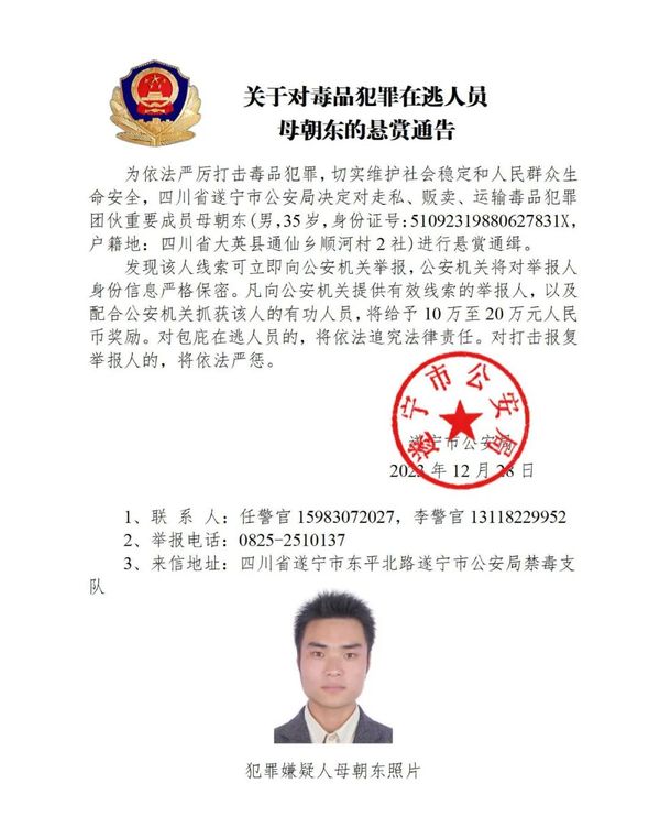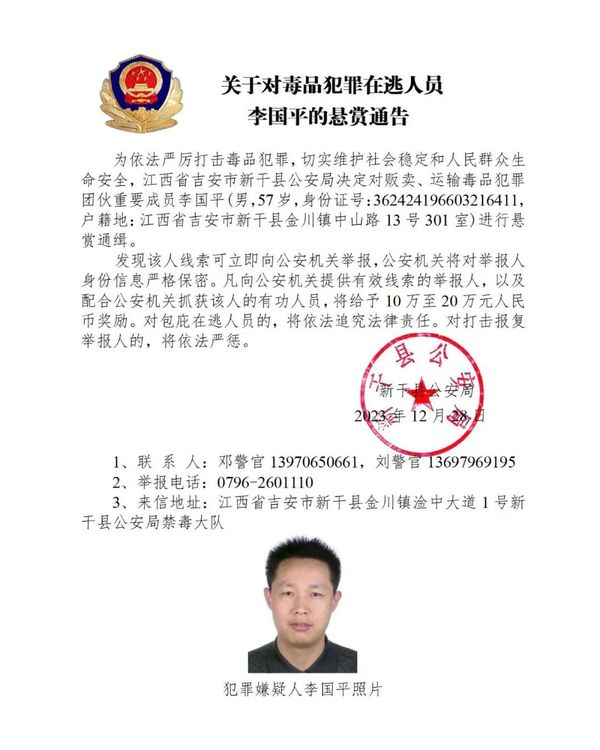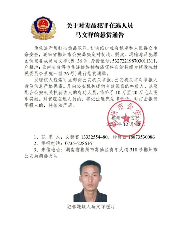 近年来,按照国家禁毒委、公安部“清源断流”行动战略部署,各地公安机关通过开展国际执法合作,对潜藏在境外向我境内大肆走私贩卖毒品逃犯开展追捕行动,累计抓获涉毒逃犯300余名,对境外贩毒团伙形成了有力震慑。为进一步依法严厉打击缅北地区毒品犯罪,全力遏制境外毒品向我渗透内流,切实维护人民群众生命健康和财产安全,各地公安机关在充分掌握相关犯罪事实和证据的基础上,决定对张安龙、曾小勇等10名藏匿在缅北地区涉毒逃犯进行公开悬赏通缉,力争早日缉拿归案,坚决铲除长期危害我社会稳定的境外“毒瘤”。其中,湖南省郴州市公安局决定对张安龙、马文祥、吴玉杨进行公开悬赏通缉;湖南省株洲市公安局决定对杨金梅进行公开悬赏通缉;江西省新干县公安局决定对曾小勇、李国平、孙强进行公开悬赏通缉;浙江省温州市公安局决定对颜欢平进行公开悬赏通缉;四川省遂宁市公安局决定对母朝东进行公开悬赏通缉;贵州省黔东南州公安局决定对龙华进行公开悬赏通缉。
