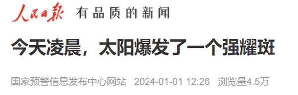 国家空间天气监测预警中心发布太阳耀斑信息提示:北京时间2024年1月1日05时55分,太阳爆发了一个强耀斑(X5.0级)。该事件发生时我国处于黎明,对我国上空电离层产生的影响较小。国家空间天气监测预警中心将密切跟踪事件发展,及时发布预报预警信息。