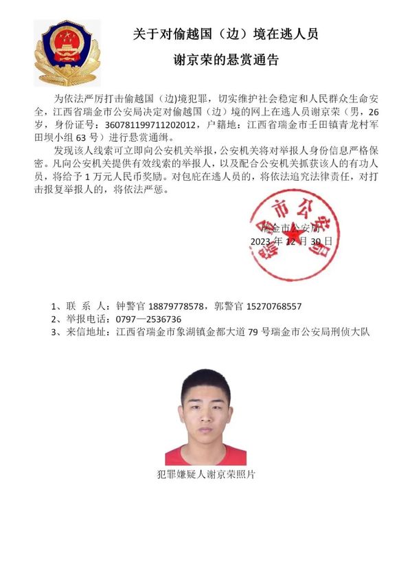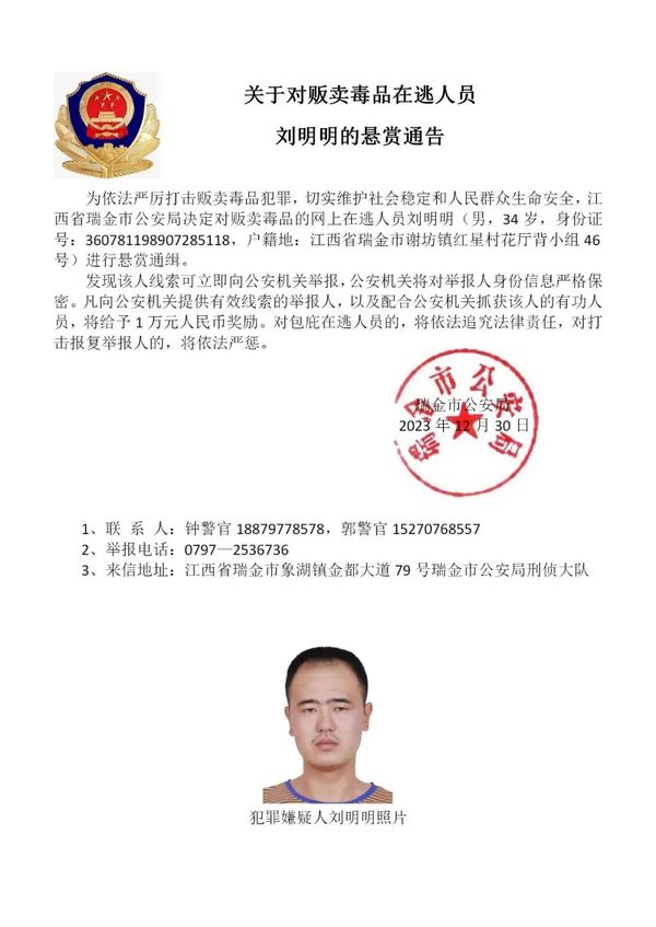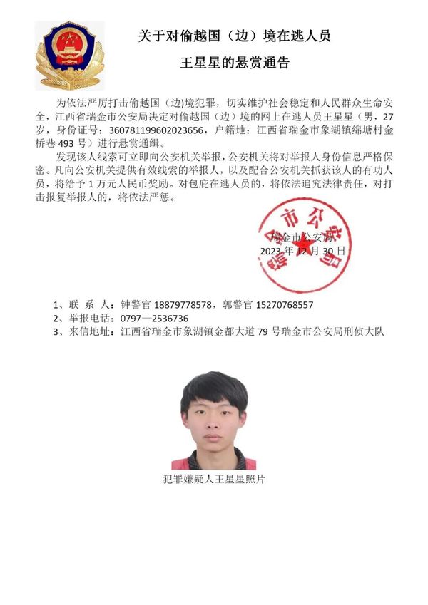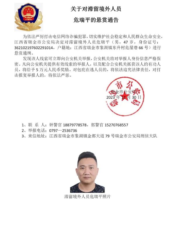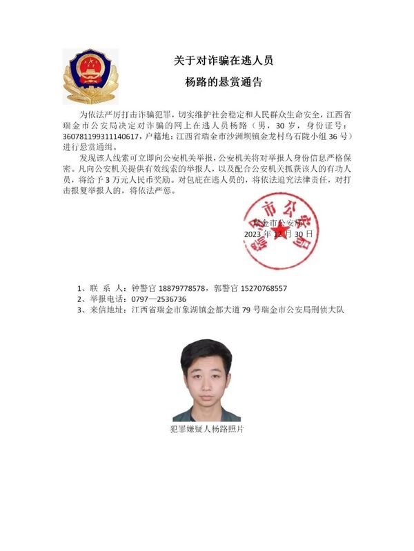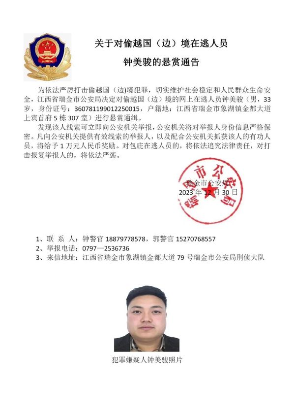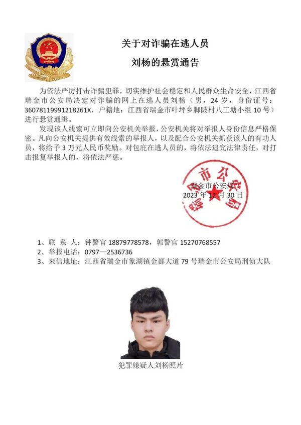 为进一步依法严厉打击缅北地区诈骗犯罪,切实维护人民群众生命健康和财产安全,江西省瑞金市公安局在充分掌握相关犯罪事实和证据的基础上,决定对钟美骏、刘杨等藏匿在缅北地区涉诈在逃人员进行公开悬赏通缉,力争早日缉拿归案,坚决铲除长期危害我社会稳定的境外“毒瘤”。