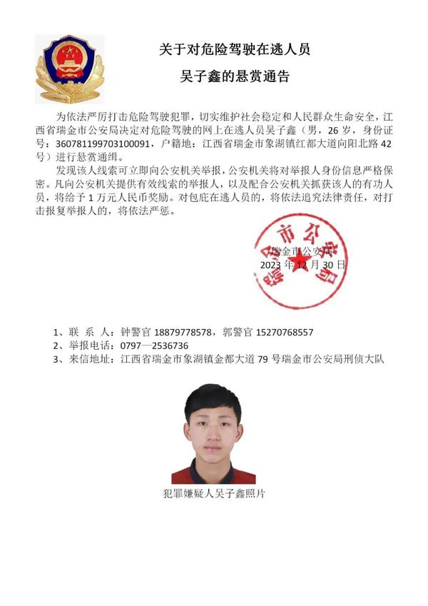 照片公布!江西警方悬赏通缉