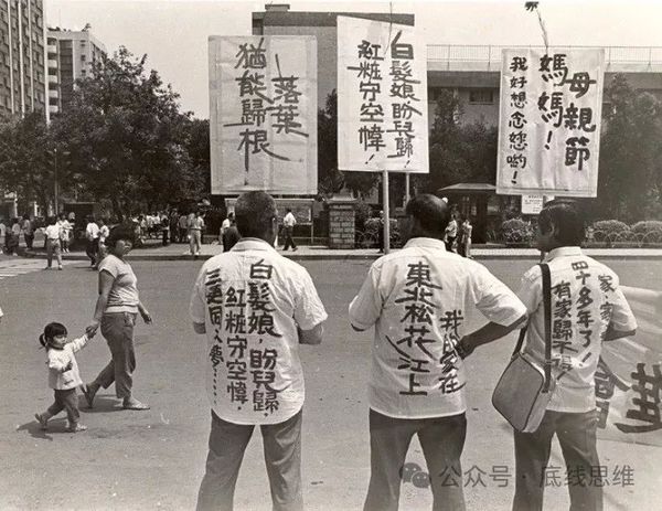 1987年大批台湾老兵走上街头,穿上写着诉求的上衣,争取回家探亲