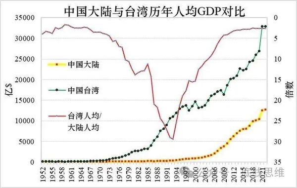 在90年代两岸确立和平框架之后,实力此消彼涨,是大陆与台湾的历史轨迹。1990年,台湾GDP为1700亿美元,相当于大陆的43.8%,达到历史最高点,1995年仍有35.7%。2022年,台湾GDP为7626亿美元,仅相当于大陆的4.2%。