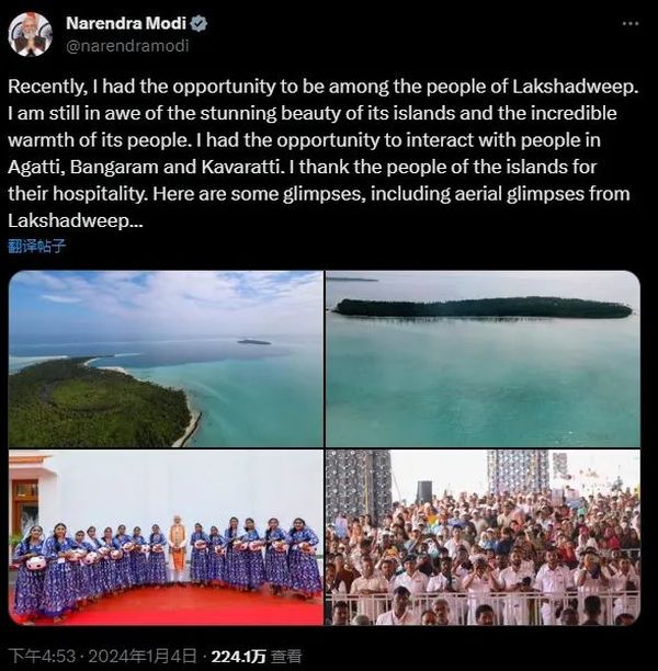 就在穆伊兹访华之前,印度总理莫迪1月4日在社交平台X(原推特)上展示他在印度西南端拉克沙群岛度假的照片和视频。外界认为,此举是在鼓励印度人去本国的拉克沙群岛旅游,意在与马尔代夫“争夺游客”。