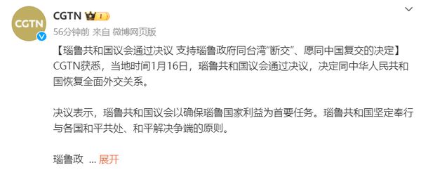 CGTN获悉,当地时间1月16日,瑙鲁共和国议会通过决议,决定同中华人民共和国恢复全面外交关系。