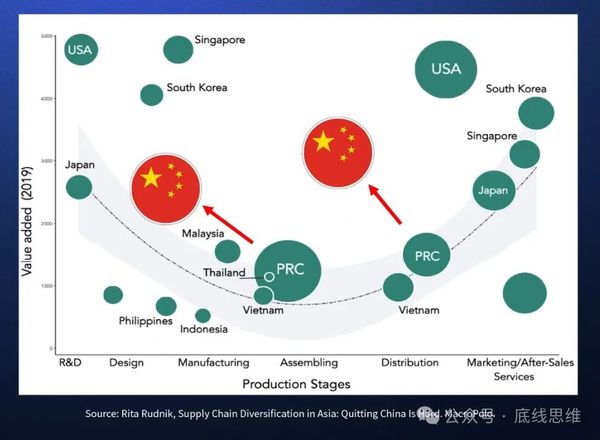 宏碁集团创办人施振荣先生提出了著名的Smile Curve微笑曲线。10年、20年前我们跟越南差不多大,很小的一个球,现在变得跟美国差不多大,但是这个球在微笑曲线的地位没怎么改变,仍旧在中间偏下,这说明我们的附加值比较低。我们要做的就是把这个球往左上方推,把附加值往上推。