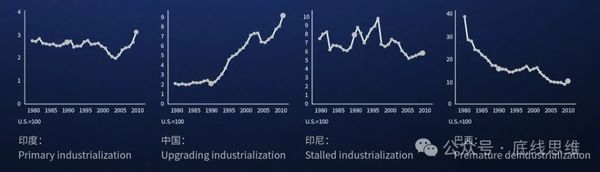 英国经济学家安迪·萨纳姆曾经对发展中国家的去工业化问题做了一个研究,他列举了四个发展中国家工业化的典型案例。第一种是以印度为代表的初级工业化,他们长期处于劳动密集型产业阶段。第二种是中国,是不断升级的工业化,产值不断提升。其实全球化这二三十年里,中国是一枝独秀,就我们一个边缘国家慢慢崛起,慢慢壮大,其他都停滞在边缘国家里。第三种是印尼,他们的产业升级没能取得成功,过早显现出去工业化的趋势。第四种是巴西,经历了长期的产业降级、去工业化的过程。我还记得我采访卢拉总统的时候,他痛心疾首地告诉我,在自由派执政的十年里,巴西丢掉了引以为傲的航空工业,从一个飞机出口国沦为了一个农业国家。