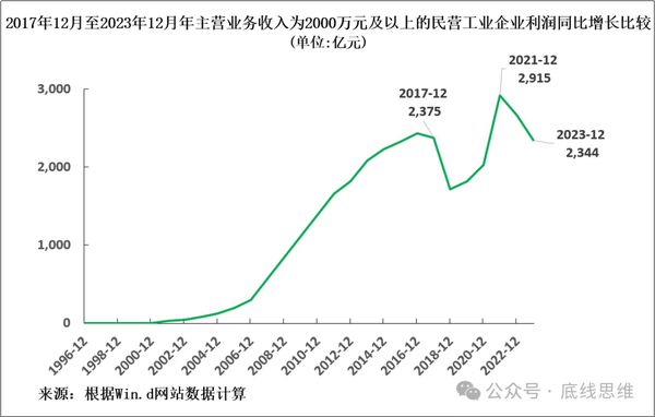 民营工业企业的盈利形势更为严峻。2023年,其利润较2021年的峰值下滑20%。同时,较7年前——2016年水平下滑4%(见图1)。从2016年底到2023年底,GDP平减指数上涨12%。也即是说,将通胀因素考虑在内,民营工业企业实际利润较六年前下滑约16%。这对民营工业企业利润产生了巨大的挤压。
