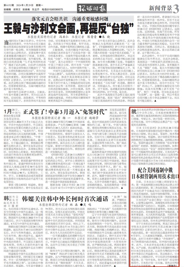 对于日本拟出台的新规,黑龙江省社会科学院东北亚研究所研究员笪志刚28日接受《环球时报》记者采访时表示,首先是日本国内政治混乱,新一届自民党总裁选举将在今年9月举行,三大派阀突然解散,而岸田支持率低迷,此时日本把中国概念“冷饭新炒”,是为了转移国内政治视线,对冲国内低迷支持率。此外,日本此举也是在配合美国遏华政策,从产业链、供应链等各方面遏制中国;同时日本自身也有诉求,以此作为筹码在中日博弈中争取自己利益最大化。