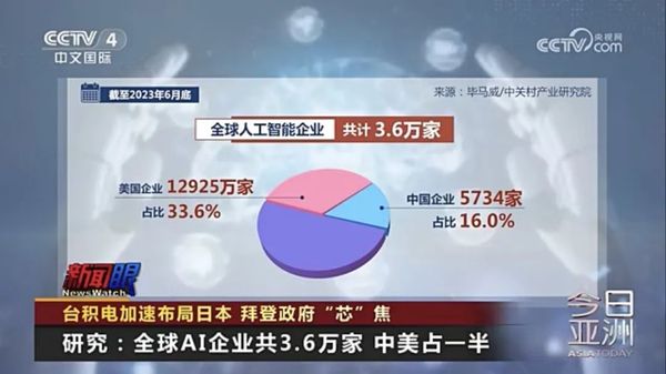 国际知名会计师事务所毕马威联合中关村产业研究院发布的一份报告显示,截至2023年6月底,全球人工智能企业共计3.6万家,其中,美国企业约1.3万家,在全球范围内占比33.6%;中国企业5734家,数量排名第二,占比为16.0%。过去几年,中国AI科技成果不断涌现。