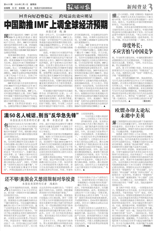 华东师范大学澳大利亚研究中心主任陈弘1月31日告诉《环球时报》记者,发表联合声明的这50人代表了澳大利亚的一批有识之士,他们既具备外交经验又拥有全局观,此时发表这样的声明非常及时。今年,亚太地区乃至世界的不确定、不安因素较多。在美国推动之下,一些地区性的争议和摩擦被放大。在此背景下,尤其是在去年11月中美元首旧金山会晤之后,澳方这50人希望借这个契机推动中美关系缓和,维护亚太地区的和平稳定,这是他们最重要的初衷。另外,他们也是想对澳现政府喊话,希望其不要沿袭上届政府的对华政策,充当“反华急先锋”,而是扮演积极建设性角色。“美国今年是选举年,可能会有反华势力横生事端。而明年,澳大利亚将迎来大选。这些有识之士也希望本国大选不要受到反华思维的影响。”陈弘表示。