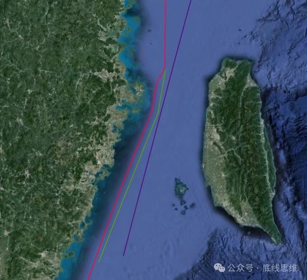 紫色为台湾当局所谓的“海峡中线”,红色为先前经由M503偏置航线飞行的实际航线,而绿色是现在开始启用的原始M503航线。