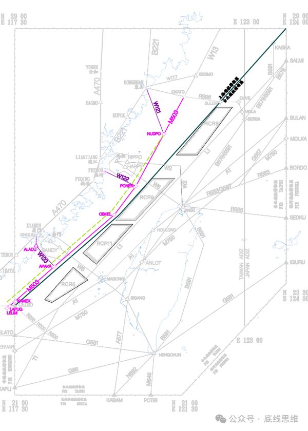 这条航线在台湾海峡上空紧贴上海飞行情报区与台北飞行情报区边界的大陆一侧,在上海飞行情报区范围之内。而W122与W123航线则是福州与厦门机场连通M503航线的衔接航线。