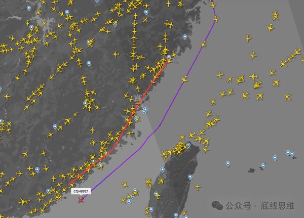 如果我们仔细看A470航线,会发现这条航线连接着长三角地区、福建地区以及珠三角地区,甚至东部地区飞往东南亚的飞机也要走这条航线,因此每天有上千架次的飞机经由这条航线。如果我们打开flightradar24查看实时空域情况,就能发现A470这条东部沿海航线堪称中国最繁忙的航线。