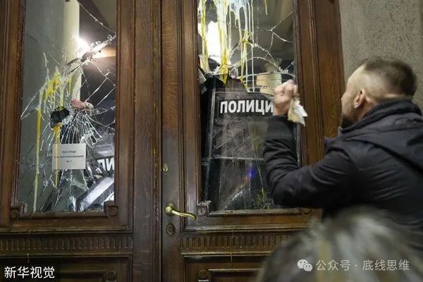 2023年12月24日,塞尔维亚贝尔格莱德,反对派支持者发动袭击,抗议选举议会选举结果,警察守卫议会大楼。图自:视觉中国